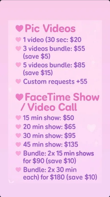 *** Weekends FaceTime SPECIAL........ $25 ( Saturday & Sunday ) ๐ฝ Content Menu ๐ฝ Twerking Naked ๐๐.......$20 Shower Fun ๐ฟ.......$35$ Solo (Toys Included)........$15 Squirting ๐ฆ.......$30 Feet .......$10 Fucking ๐........$100 SloppyToppy ๐........$25 FootJobs ๐๐ฆถ........$20 *** Fetish Friendly *** ๐งVirtual only ๐ฅ Online fun, adult content available, and private 1-on-1 video call sessions. No meetups, no in-person. Everything is done online. ๐ Message me if youโre interested